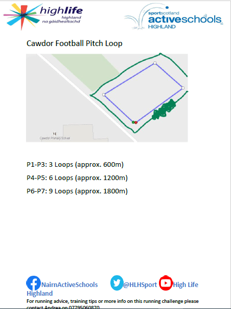 Thank you to the Cawdor families who organised for the grass to be cut at the football pitches next to the school to create a track, and thank you you to the children of key workers and Mrs Macarthur who had measured this out prior to the full-school return this week.