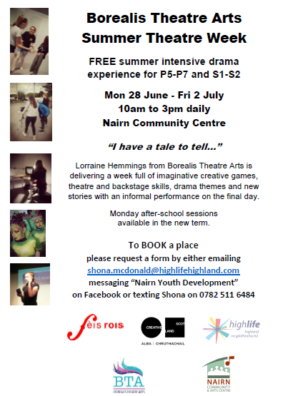 P5-P7 FREE Summer Drama Classes 9Jun 2021Add a comment See information below about free drama classes for children in P5-P7 available in Nairn Community Centre during the first week of the summer holidays. Share this: Click to share on X (Opens in new window) X Click to share on Facebook (Opens in new window) Facebook Like Loading... Related