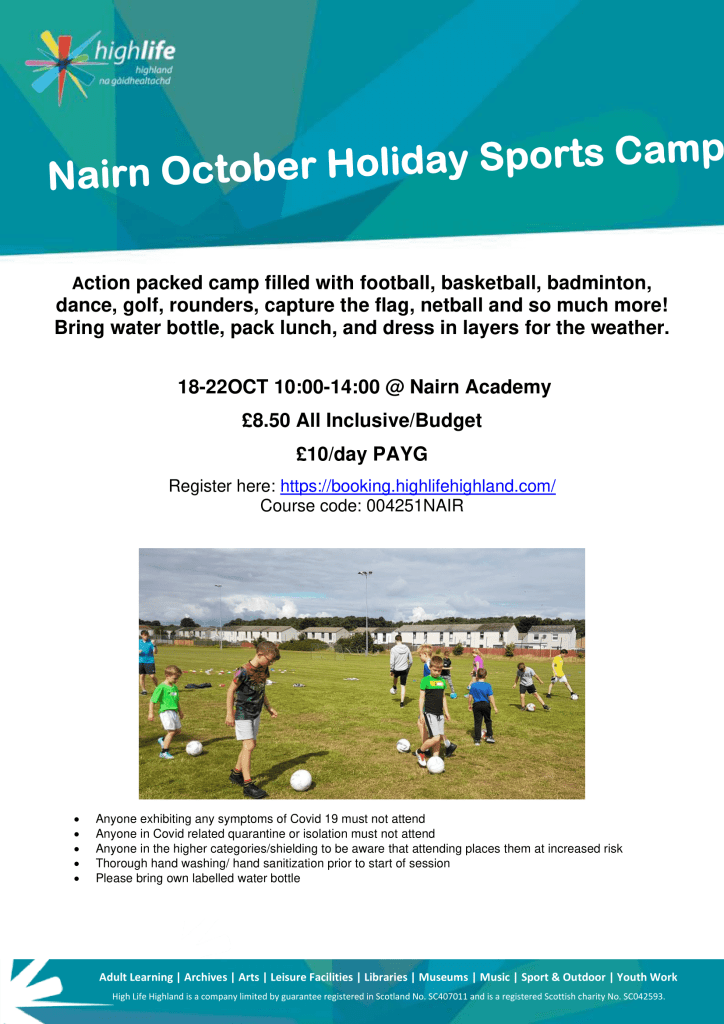 Nairn October Holiday Sports Camp – High Life Highland 24Sep 2021Add a comment Share this: Click to share on X (Opens in new window) X Click to share on Facebook (Opens in new window) Facebook Like Loading... Related