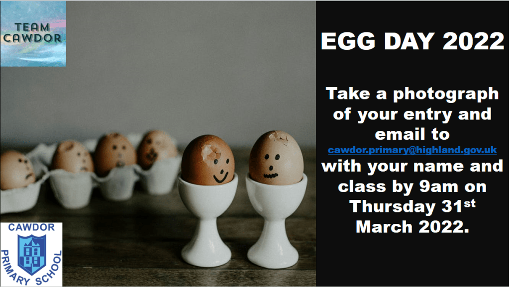 For any children and families that would like to take part in our annual ‘Egg Day’ competition, this will be a home learning challenge over the next two weeks. Children can design a hard-boiled egg in any way that they choose – creating a character (and adding some scenery if they wish). For anyone taking part, you should email a picture of your egg with your child’s name and class to cawdor.primary@highland.gov.uk by 9am on Thursday 31st March 2022.