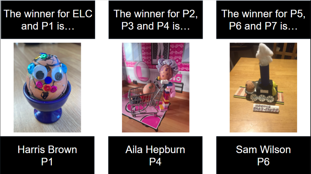 Egg Day Entries and Winners 1Apr 2022Add a comment We’ve had our final assembly of the term and announced our Egg Day 2022 winners – well done to everyone that entered – they were superb! Check out our entries and winners… Share this: Click to share on X (Opens in new window) X Click to share on Facebook (Opens in new window) Facebook Like Loading... Related