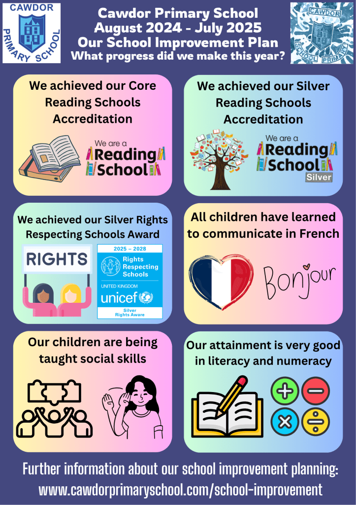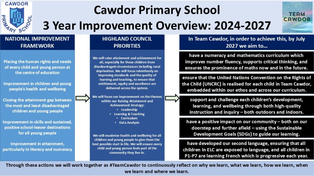 Each year we then produce a school improvement plan with the key areas for the year ahead. We have used Cawdor’s Improvement Five to create our school improvement plan for the 2025/2026 academic session. Our school improvement plan has been created in three formats:
