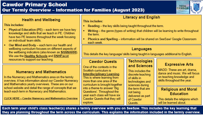 Each term your child’s class teacher(s) shares a termly overview with you on SeeSaw. The includes the key learning that they are planning throughout the term across the curriculum. The information below explains what is included in the termly overview.